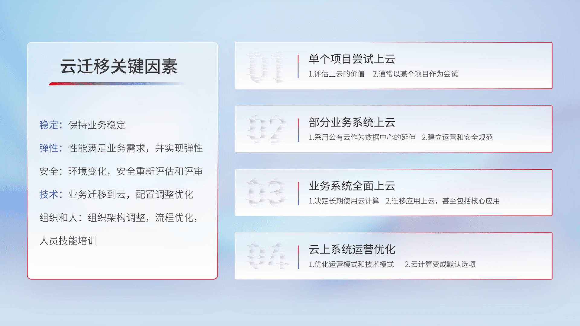 结合实际业务,,,从规划设计、、、、云平台选型、、、云原生改造、、、数据迁移、、集成交付,,,迁移全过程为客户识别最佳上云路径,,做好风险识别管理,,,,设计网络架构、、、身份权限、、安全审计合规、、、、操作审计、、、、日志审计、、、监控告警策略、、、多站点容灾设计等,,,对云上基础设施进行整体规划,,提升IT治理水平,,以满足弹性、、、、高可用、、高性能的需求。。。